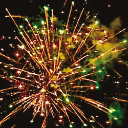 9. Свист, сфера золотых хвостов с переходом в зеленые звезды (цветная хризантема) и золотое мерцание