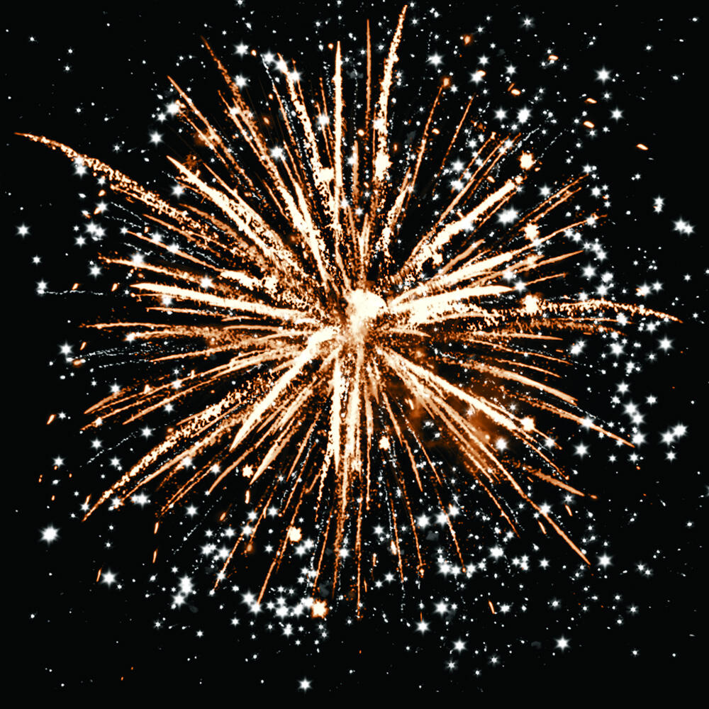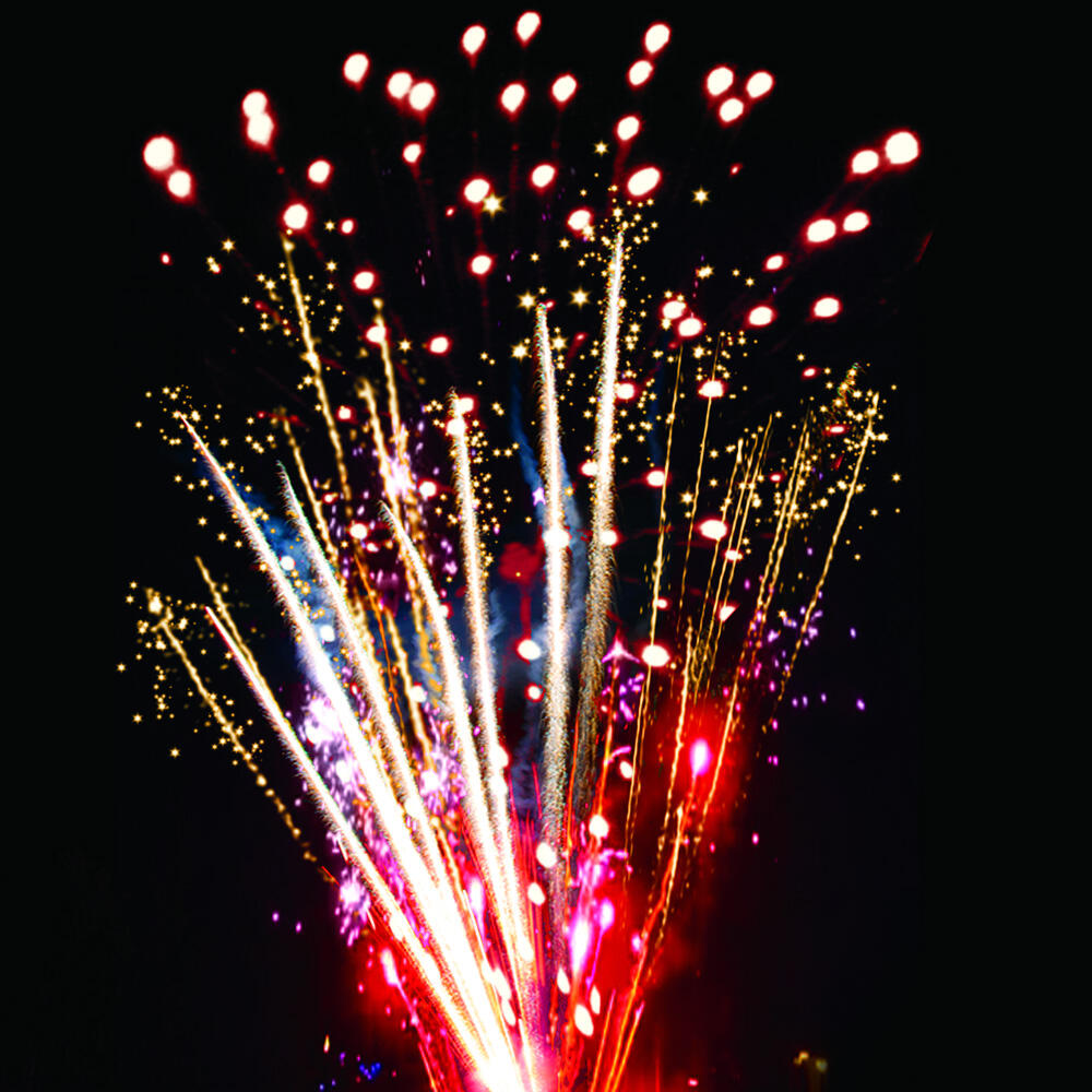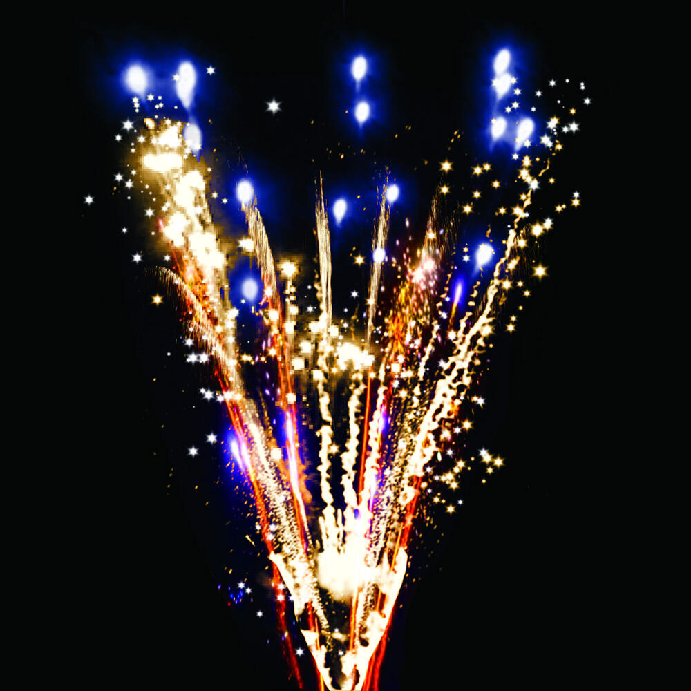 1-2. Веер. Золотые трассы с серебряными трещащими и золотыми искрами; синие и красные огни. Верхний уровень. Разноцветные кометы разрываются сферами из: