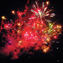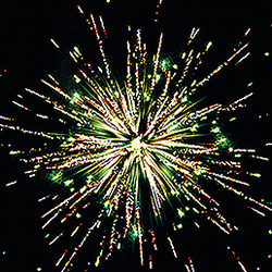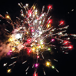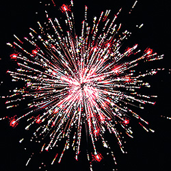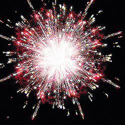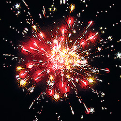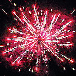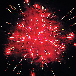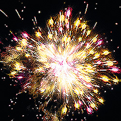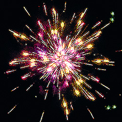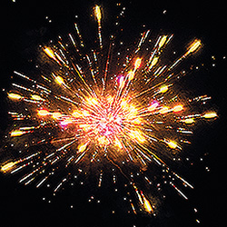 3. красных, фиолетовых, желтых и белых мерцающих огней. 2-й блок "Цвет и треск". Разноцветные кометы разрываются сферами из:
