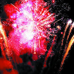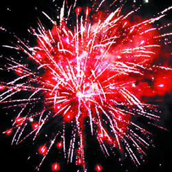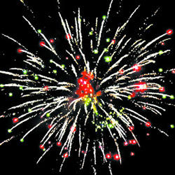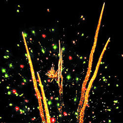 7. 2 уровня. Веер W-формы: Внизу - зелено-красное мерцание. Вверху - по бокам - красные кометы с пышными хвостами, в центре - комета с пышным хвостом разрывается серебряными звездами с пышными хвостами (кокос), красными мерцающими звездами и облаком трещащих разрывов (трещащая хризантема).
