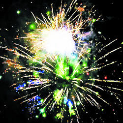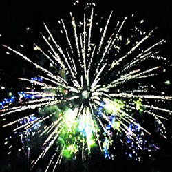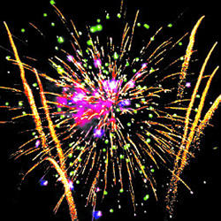 8-9. Красочная концовка. Выстреливает одновременно: Множество серебряных ниспадающих нитей (парча) и зелено-красное мерцание. Синие и зеленые букеты звезд (падающие листья).