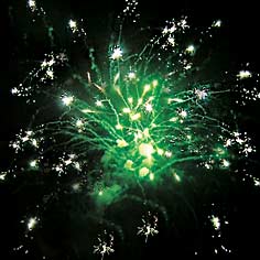 Впечатляющее обилие множественных разноцветных разрывов с разнообразными дополнительными эффектами: треском, шуршанием, мерцанием.
