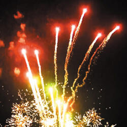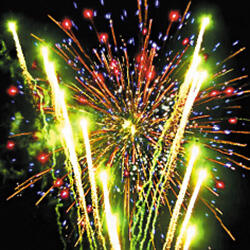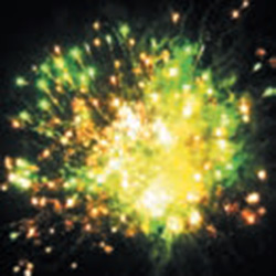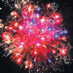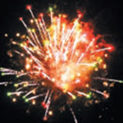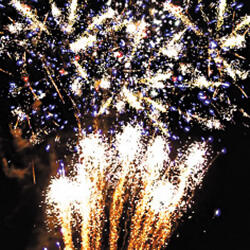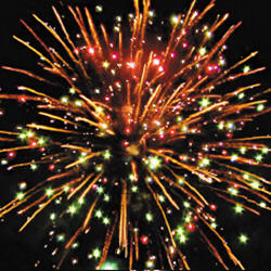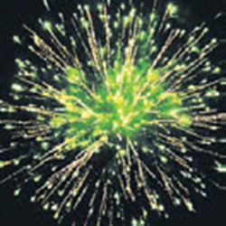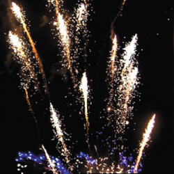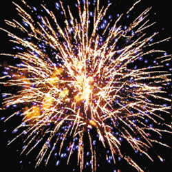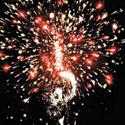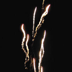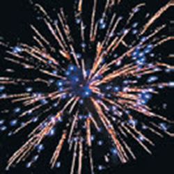8. Красочная концовка. Веер: Трещащие кометы и синие звезды разрываются шуршащими хвостами и синими звездами.