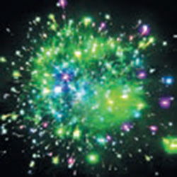 5. Веер Z-формы 2 уровня: внизу - Хаотично разлетающиеся серебряные звезды (рыбки) и синие звезды, вверху - Трещащие кометы.