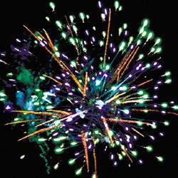 18. Вертушка разрывается сине-зелено-золотой мерцающей сферой (пион).