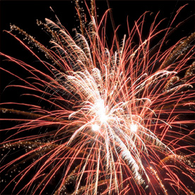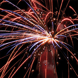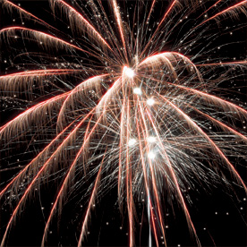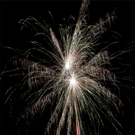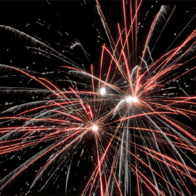 Разноцветные кометы разрываются сферами из: крупных красных и крупных голубых огней; золотых форсов, красных и разлетающихся трещащих огней; красных огней и серебряных форсов; зеленых огней и серебряных форсов; красных огней и золотых форсов с серебряными шуршащими искрами (залпы).