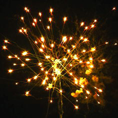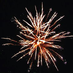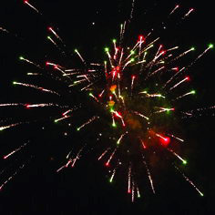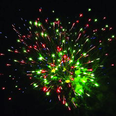 Залп красных звезд разрывается серебристыми трещащими кометами с мерцанием, серебристыми трещащими кометами с зелеными мерцанием, сферой золотых звезд. Красные звезды разрываются сферой красных, зеленых и синих звезд, большой сферой красных и зеленых звезд с белыми хвостами с треском и мерцанием. Свистящие белые кометы. Залп красных звезд разрывается огромной сферой серебряных комет с треском.