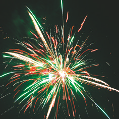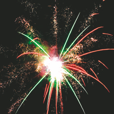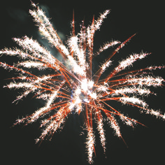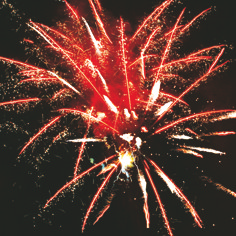 Горячий приветственный салют для всех компаний в округе. Красные и зеленые звезды разрываются цветными, мерцающими звездами с мерцающими хвостами. Серебряные кометы разрываются серебряными мерцающими хвостами и красными мерцающими звездами. Красочная концовка: залп серебряных комет разрывается множеством серебристых трещащих хвостов.