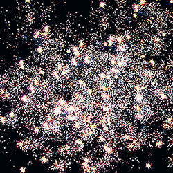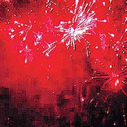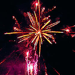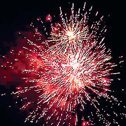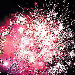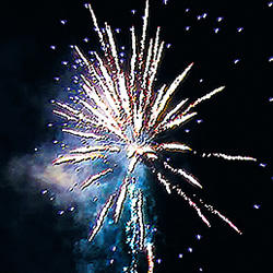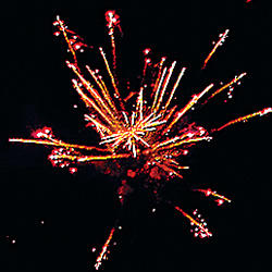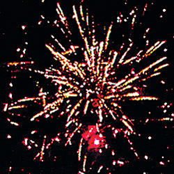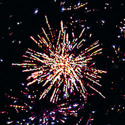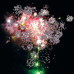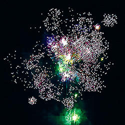 Комбинированный фейеррверк с калибрами зарядов от 15 мм до 30 мм. 12 эффектов. 2 уровня. Нижний уровень: букеты из трещащих огней. Разноцветные кометы, свистящие элементы разрываются сферами из: