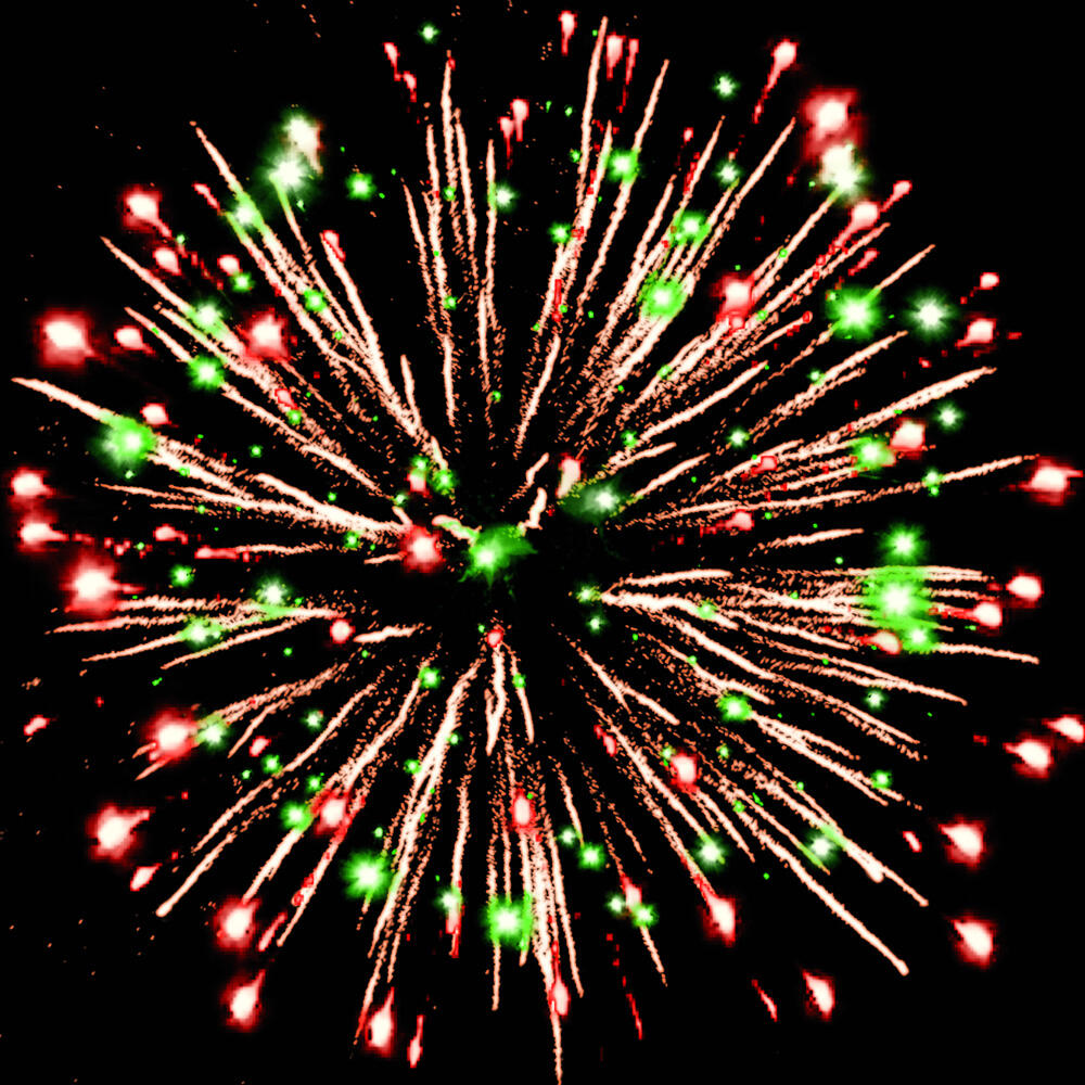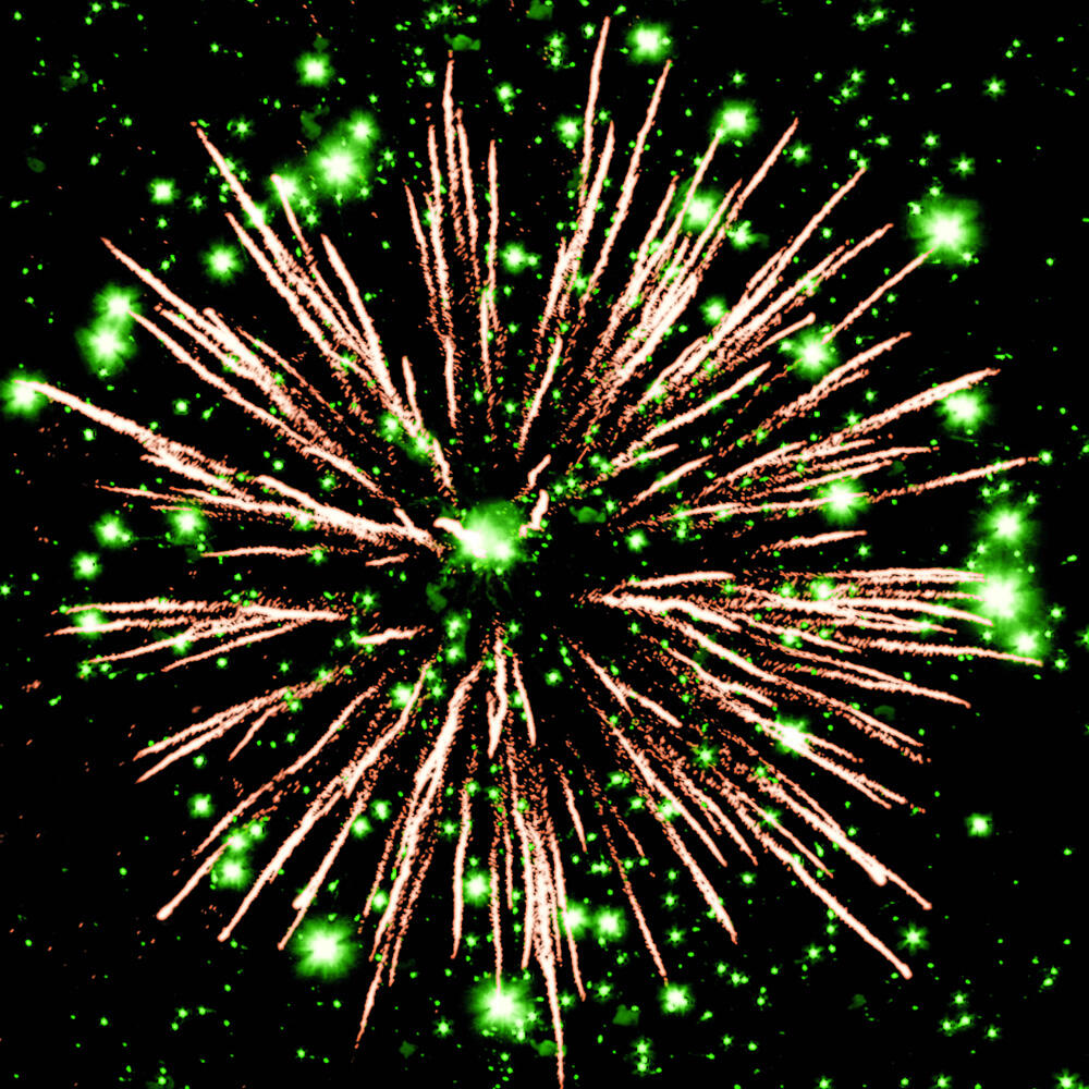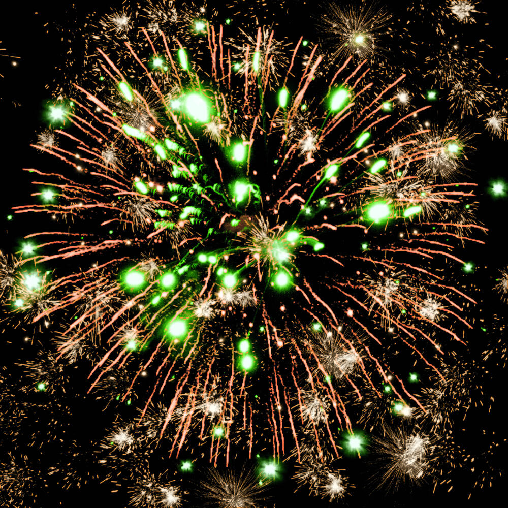 8-9. Сферы из красных, зелёных огней и золотых форсов с золотыми трещащими искрами