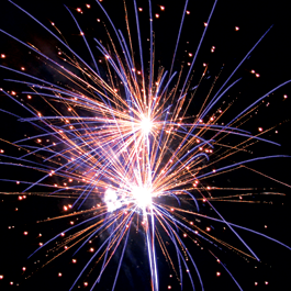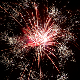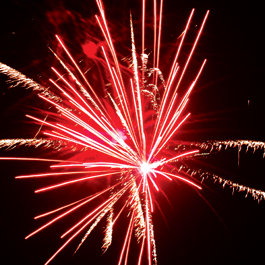 Фейерверк в одной коробке. Яркие цветные звезды разрываются разноцветными звездами с искристыми, золотыми и серебряными мерцающими хвостами. Красная комета разрывается красными звездами с белыми искристыми хвостами и золотым треском.