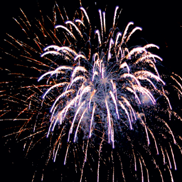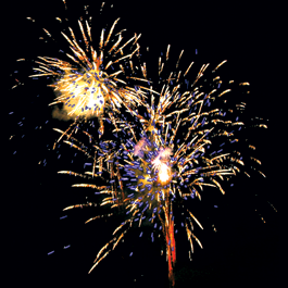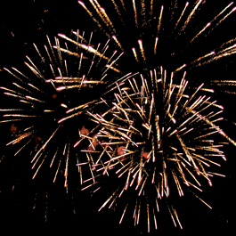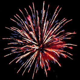 Фейерверк в одной коробке. Красная звезда разрывается красными искристыми хвостами и голубыми звездами. Зеленая звезда разрывается синими звездами и красными мерцающими звездами. Красные звезды разрываются трещащими золотыми хвостами, розовыми и золотыми звездами, множеством белых искристых хвостов.