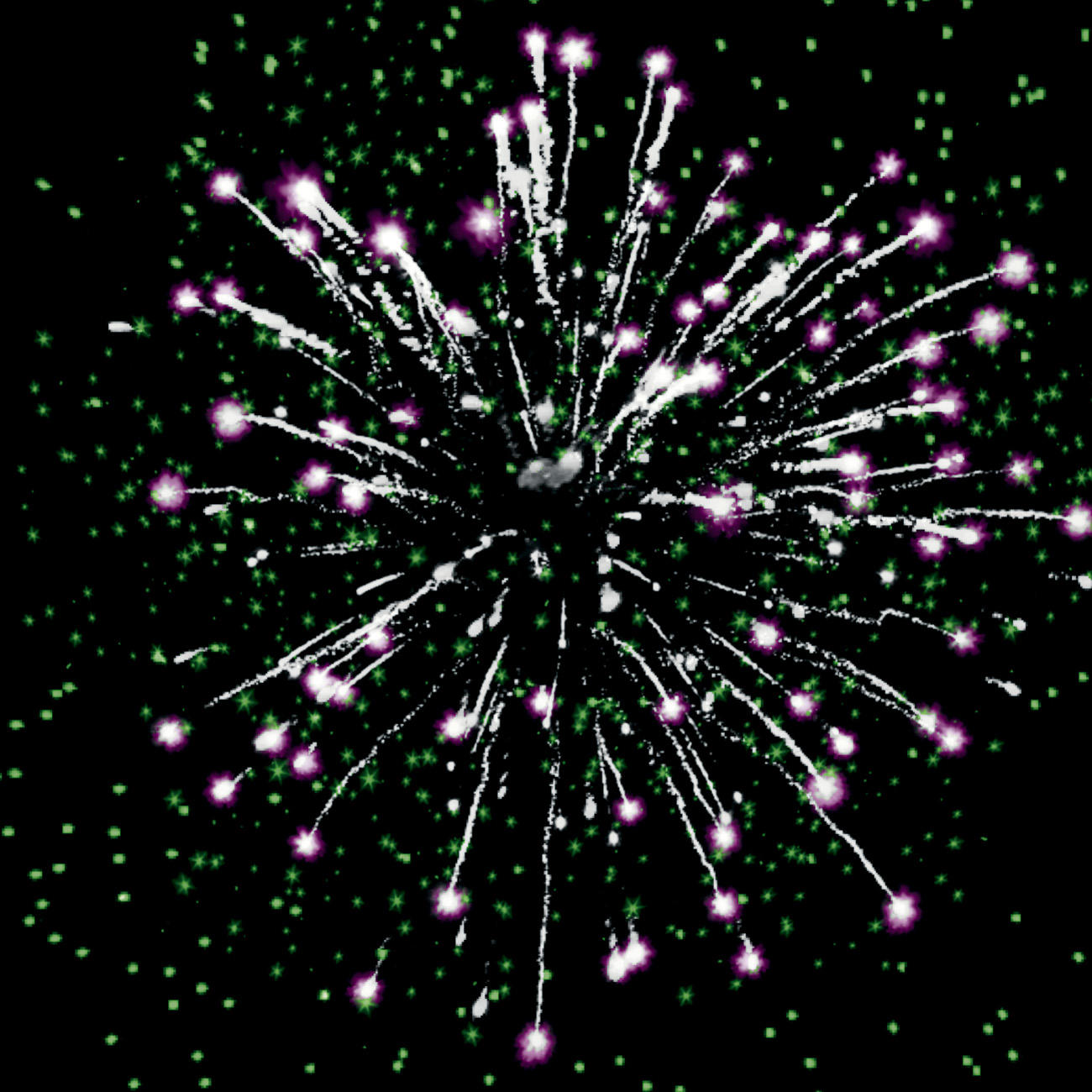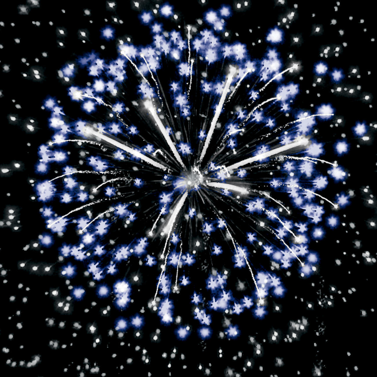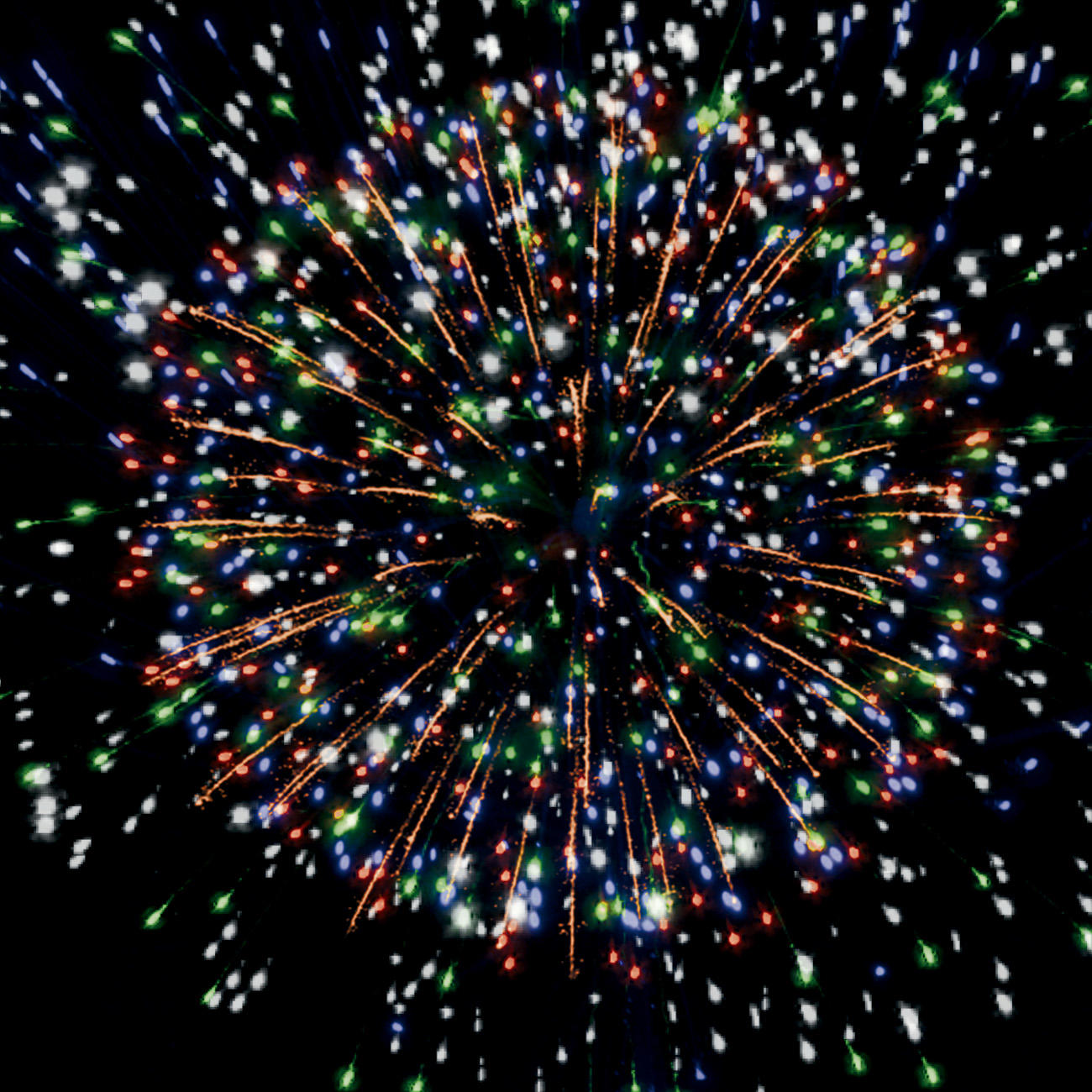 22 эффекта: 2 уровня. Свистящие элементы, разноцветные кометы разрываются сферами из: