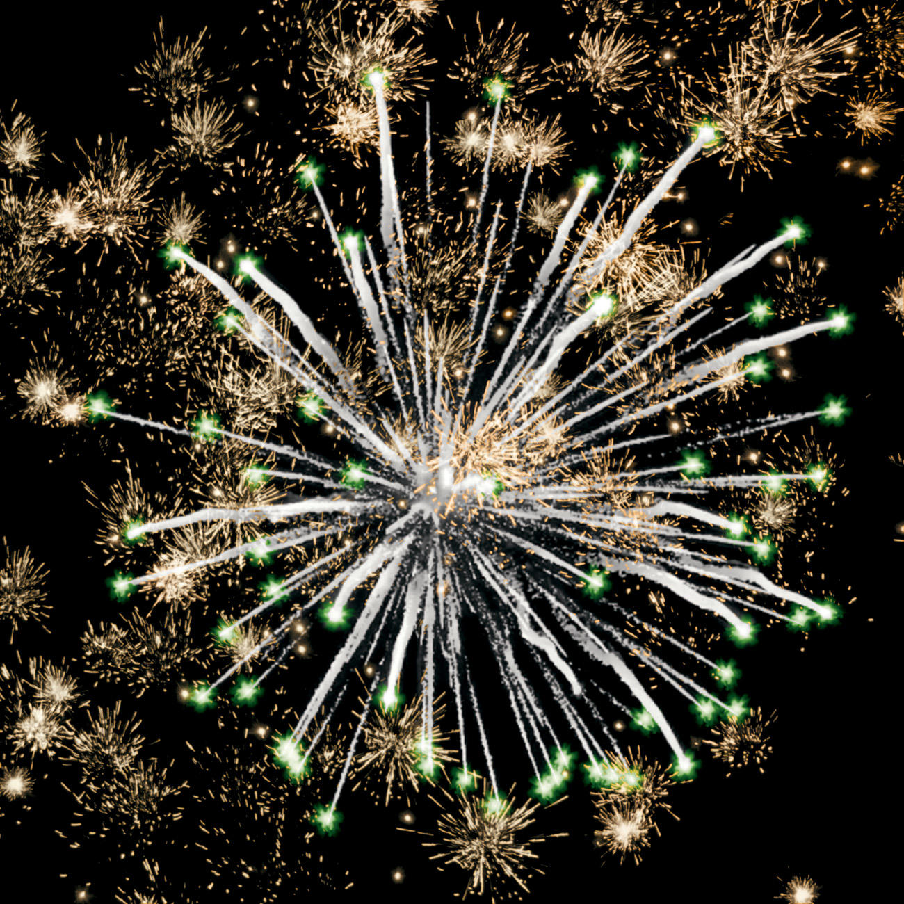 2. серебряных форсов с зелеными огнями на концах и множества трещащих искр.