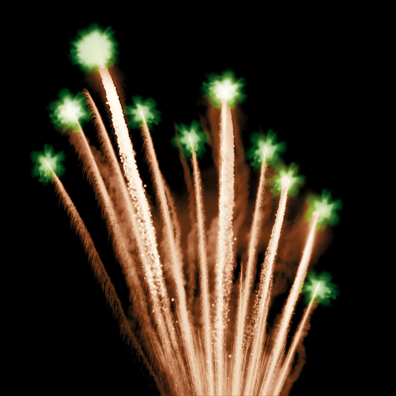 9. веер. Последовательно вылетают искристые трещащие трассы с зелеными огнями на концах.