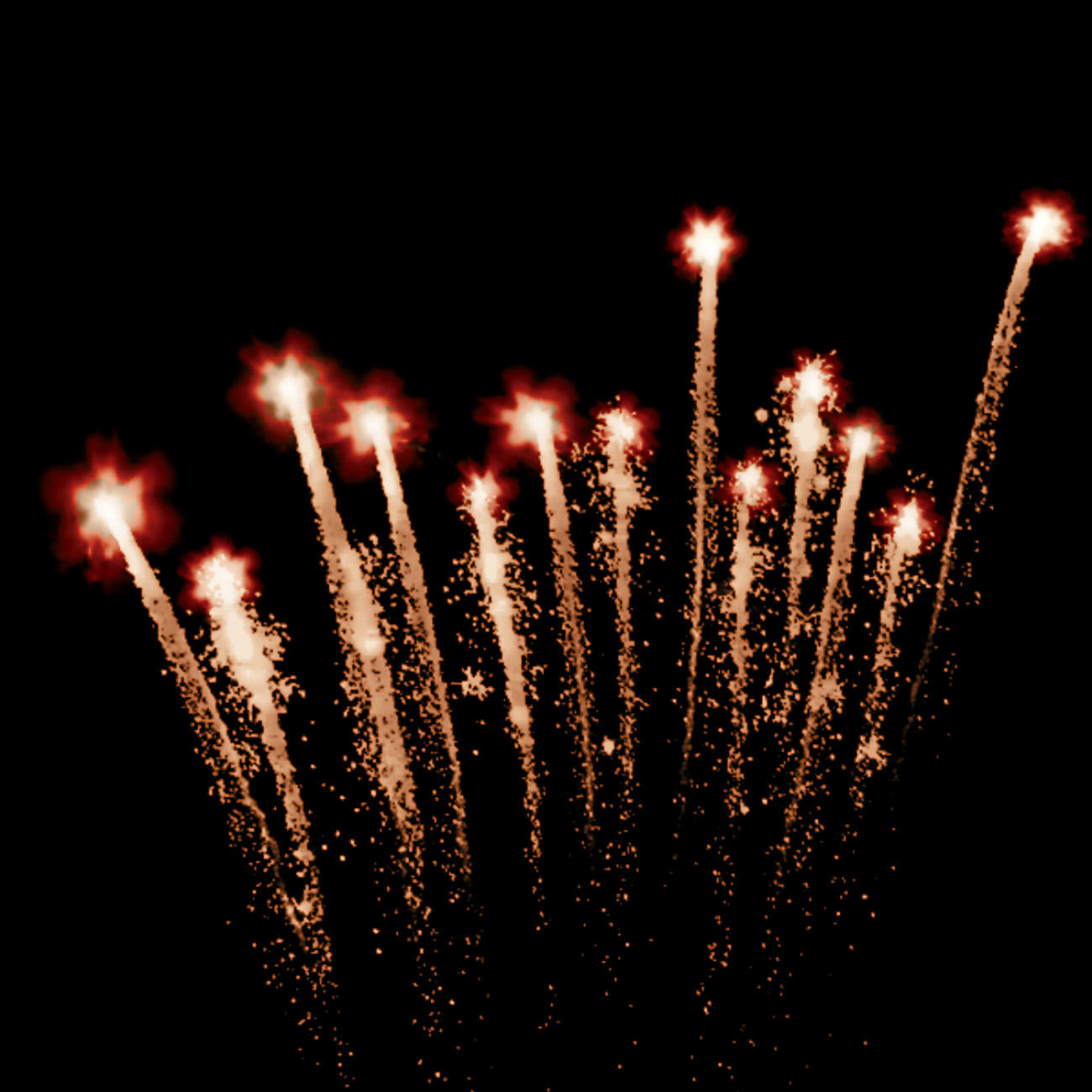 8. веер. Последовательно вылетают искристые трещащие трассы с красными огнями на концах.