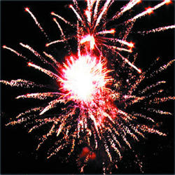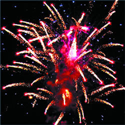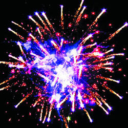 10. Красочная концовка: Красные звезды с пышными хвостами (кокос), синяя сфера (пион) и треск.