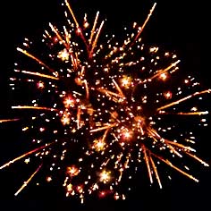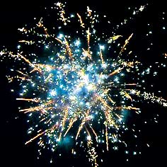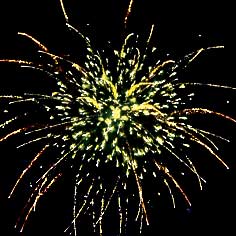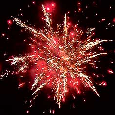 Красная звезда разрывается золотыми мерцающими звездами и золотыми хвостами. Зеленая звезда разрывается красными мерцающими звездами и золотыми кометами с шуршащими хвостами. Синяя звезда разрывается зелеными звездами и золотыми ниспадающими нитями. Красная звезда разрывается золотыми хвостами, переходящими в шуршащие звезды и белыми мерцающими звездами. Зеленая звезда разрывается серебряными кометами с шуршанием.