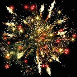 Представьте себе мерцающий пион в красно-белых тонах, который создает волшебную атмосферу. А затем серебряная парча, спускающаяся вниз нитями и превращающаяся в трещащую хризантему, окутывающую вас своим блеском.