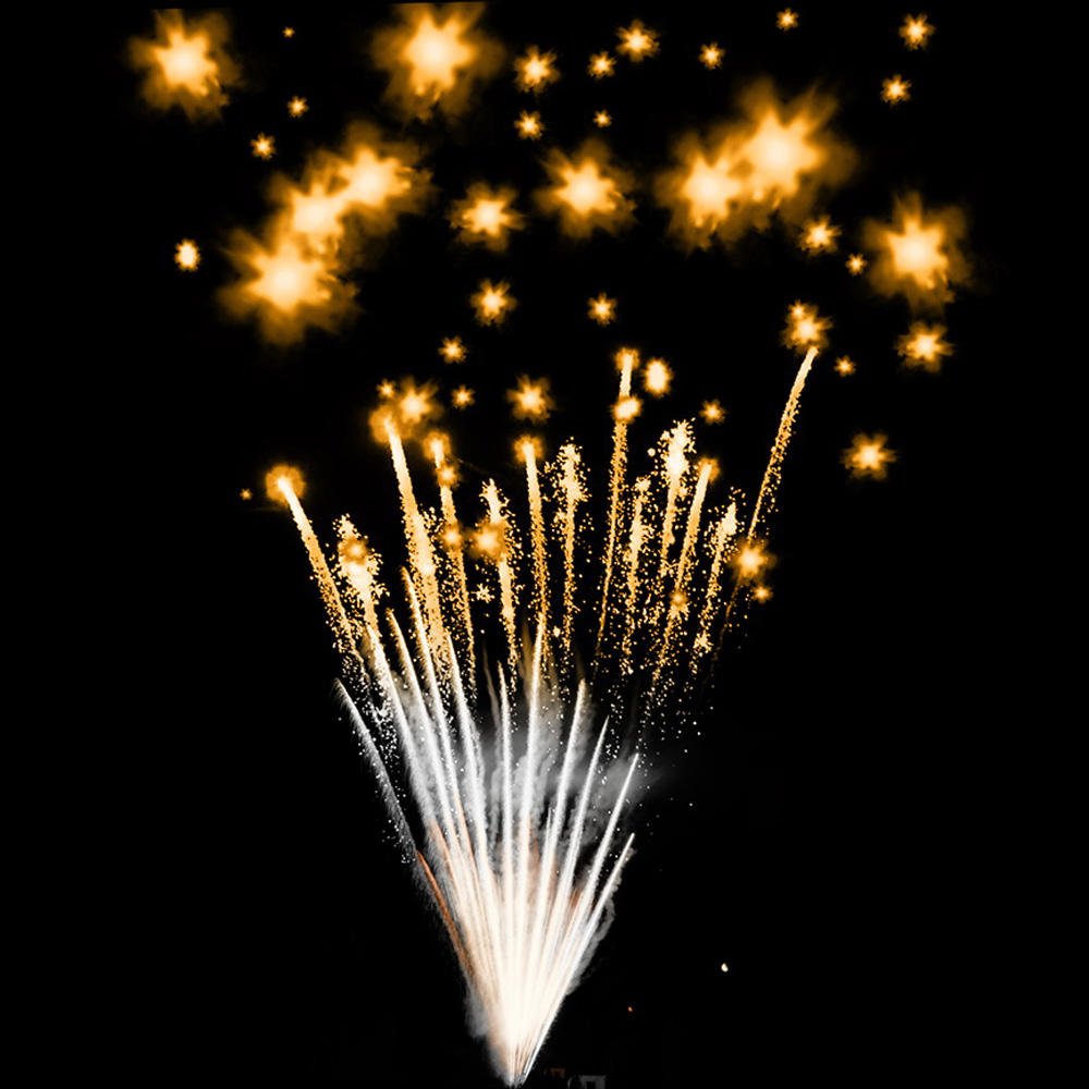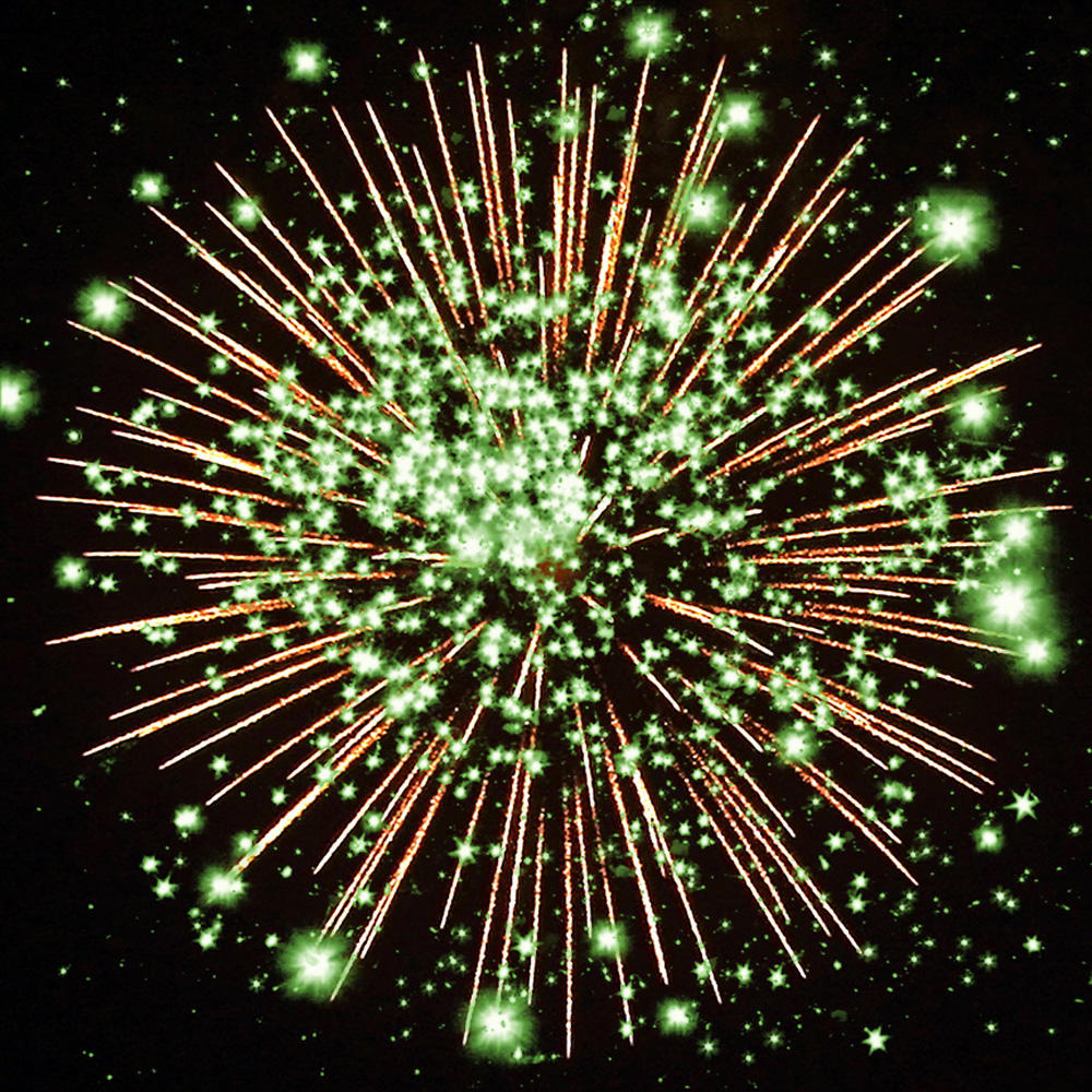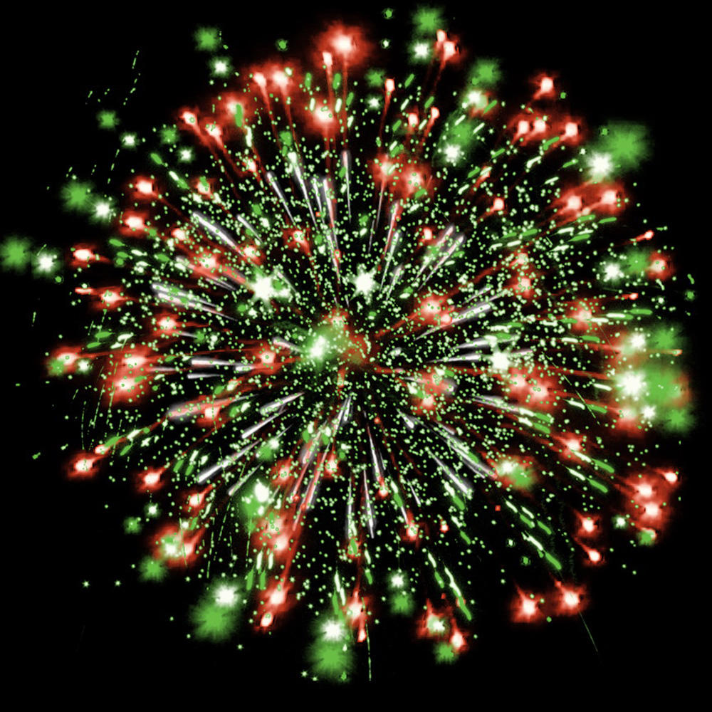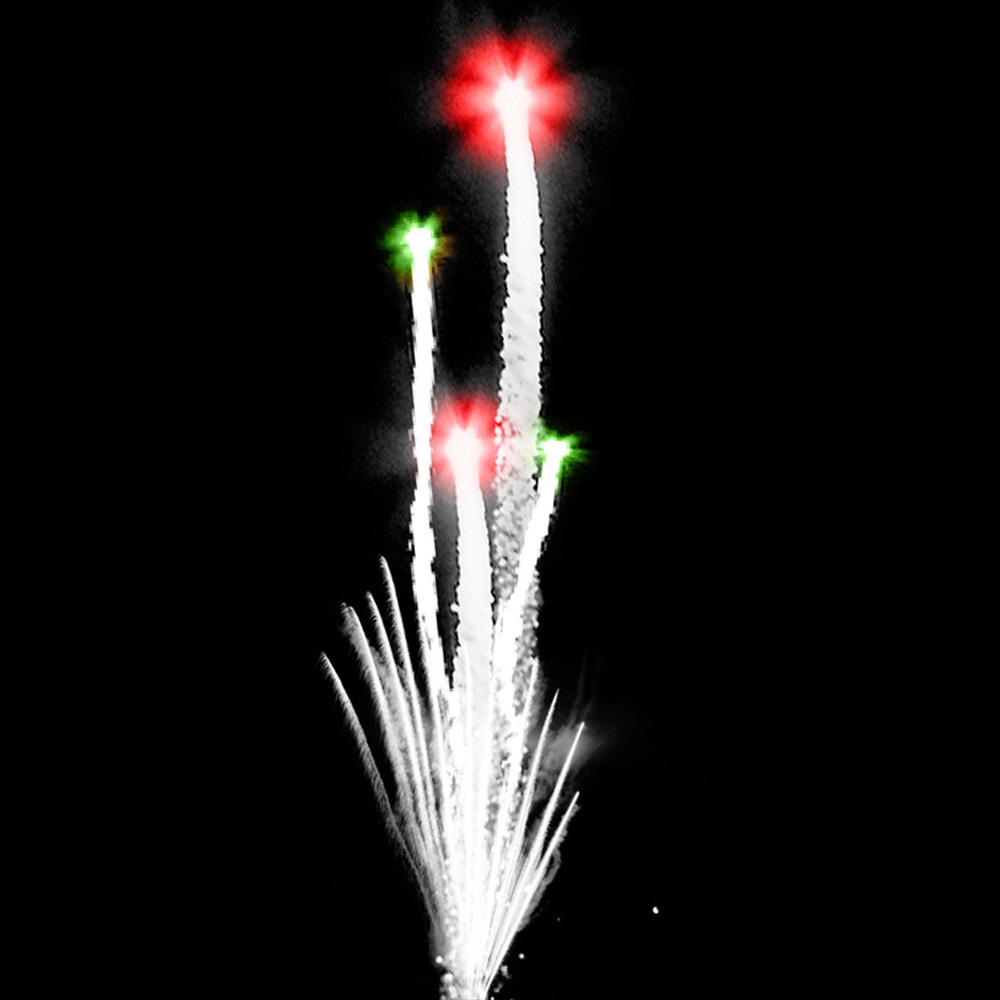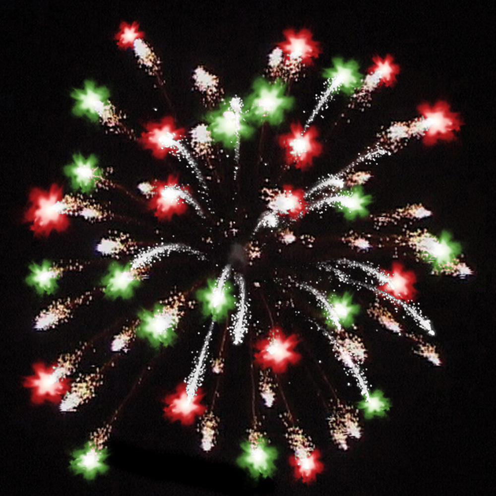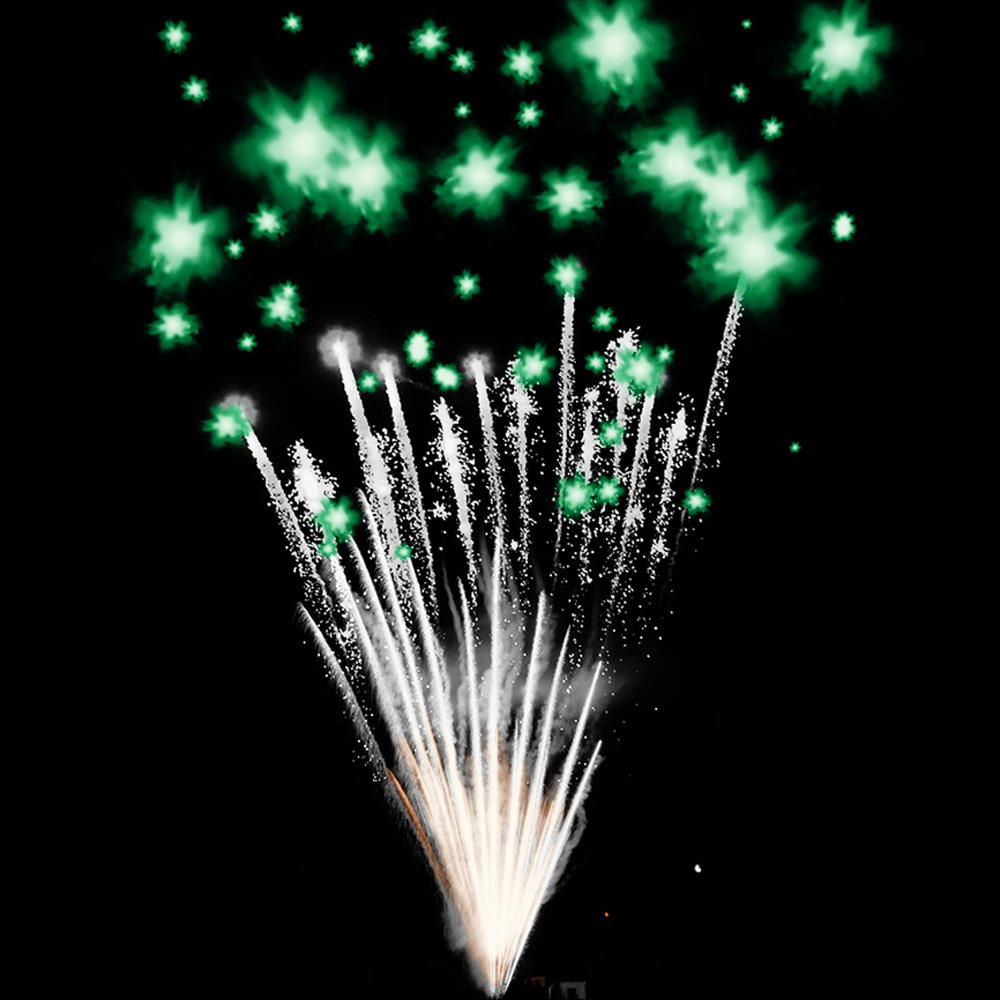 16. серебряных форсов с трещащими искрами и красными и зелёными огнями на концах.