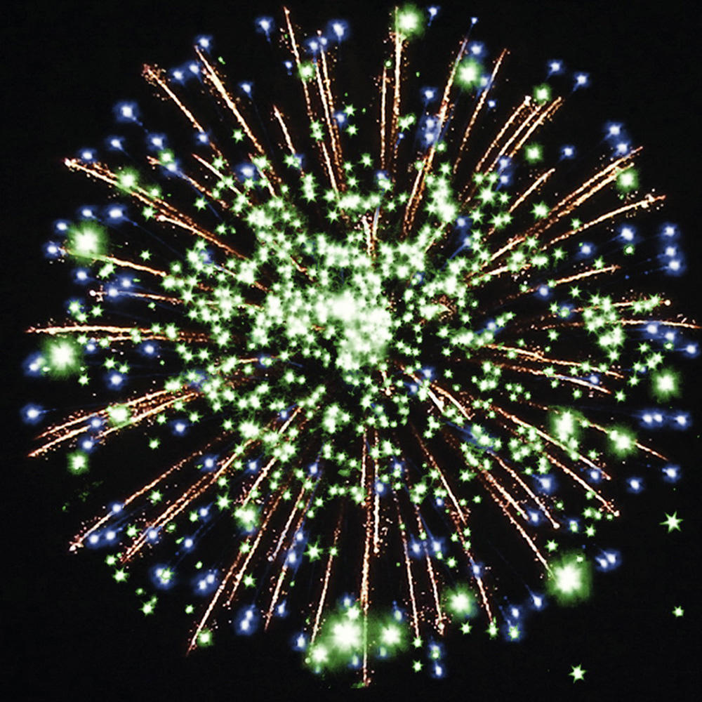 3-6. Букеты из золотых, синих, мерцающих золотых, мерцающих зелёных огней. Верхние уровни. Сферы из: