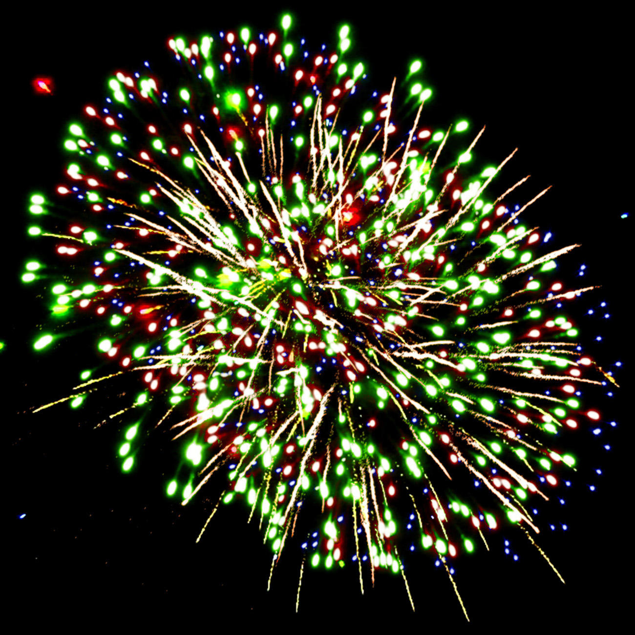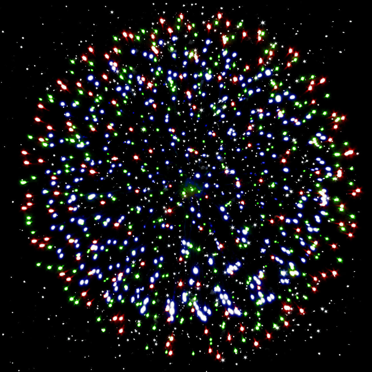 Сфера из красных, зелёных, синих и серебряных мерцающих огней