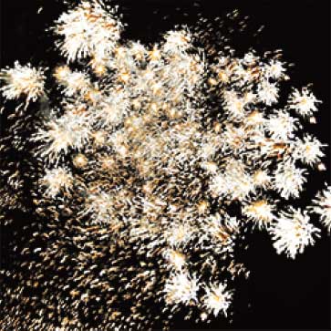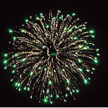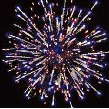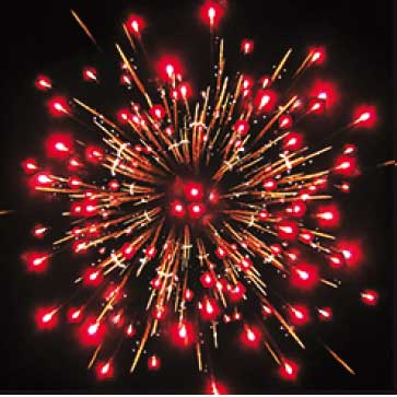 4 эффекта. Разноцветные кометы; искристые трещащие трассы разрываются сферами из: красных огней с форсами и белых мерцающих огней: зеленых мерцающих огней и серебряных форсов в центре; красных мерцающих огней и серебряных форсов с синими огнями на концах; искристых трещащих форсов (залп).