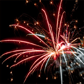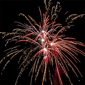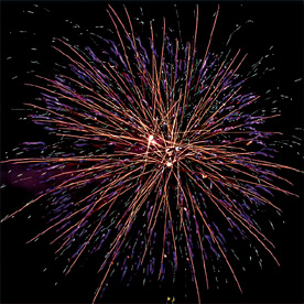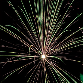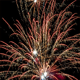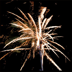 Нижний уровень: букеты из золотых форсов и красных мерцающих огней. Разноцветные кометы разрываются сферами из: красных мерцающих огней и золотых форсов; золотых форсов с трещащими искрами и красными огнями на концах; золотых форсов с трещащими искрами и зелеными огнями на концах; золотых форсов с трещащими искрами и синими огнями на концах. Кольцо из швермеров с красными мерцающими огнями в центре.