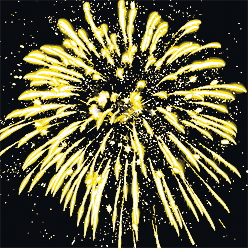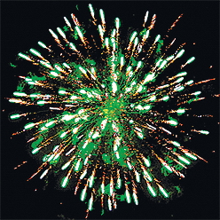 Комбинированный салют, 40 зарядов калибром 30, 38 и 50 мм. Разноцветные кометы, золотые, серебряные трассы разрываются сферами из: