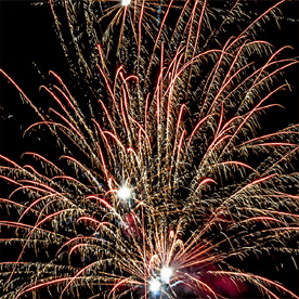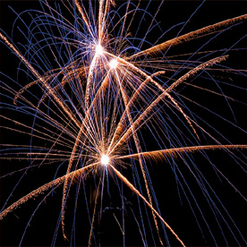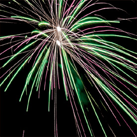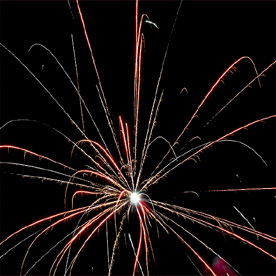 Разноцветные кометы разрываются сферами из: крупных красных и белых мерцающих огней; зеленых огней и фиолетовых огней с серебряными форсами; синих огней и золотых форсов; красных огней и золотых форсов с серебряными трещащими искрами.