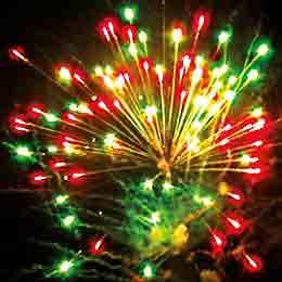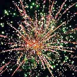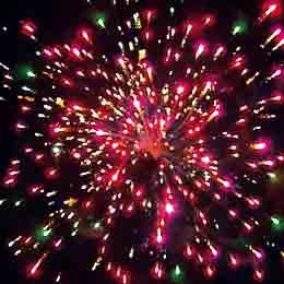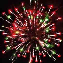 Красные, синие, зеленые, малиновые звезды с белыми хвастами и белое, зеленое мерцание. Золотые шуршащие хвосты и красное, зеленое мерцание. Золотые шуршащие хвосты и оранжевое мерцание Красочная концовка: большая сфера золотых хвостов.
