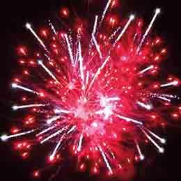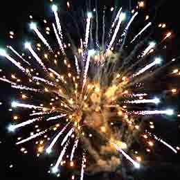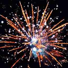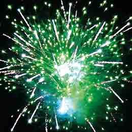 Желтые или красные или зеленые звезды и белые кометы, золотые хвосты и белое мерцание. Зеленые звезды и золотые хвосты. Белые вертушки. Красные и лимонные звезды. Красочная концовка: огромная сфера золотых шуршащих хвостов с красными звездами.