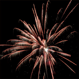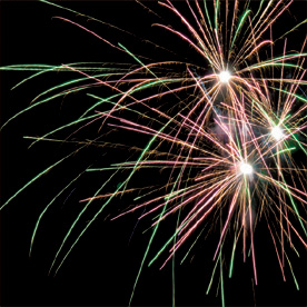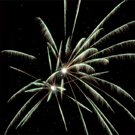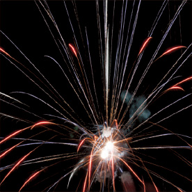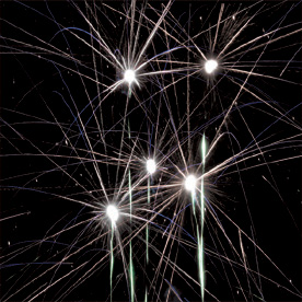 Разноцветные кометы разрываются сферами из: красных и голубых огней; фиолетовых и зеленых огней; красных огней и золотых форсов с шуршащими искрами; зеленых огней и золотых форсов с шуршащими искрами; синих огней и серебряных форсов (залп).