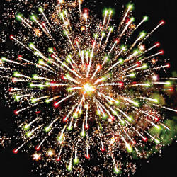 1-6. Выстреливает подряд: Сфера золотых хвостов с переходом в красные и синие звезды (цветная хризантема) Сине- фиолетово- зеленая мерцающая сфера (пион) Множество серебряных ниспадающих нитей (парча) и облако треска (трещащая хризантема) Сине- красно- белая мерцающая сфера (пион) Множество золотых ниспадающих нитей (парча) и золотое мерцание Красно- зеленые звезды с пышными хвостами (кокос) и облако треска (трещащий дождь)