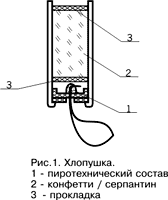 Корпуса хлопушек изготавливаются из бумаги или пластмассы в виде цилиндра, конуса, бутылочки, конфеты и т.п. При рывке за шнурок хлопушки рис.1,