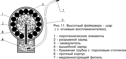 Зажигательный шнур у многих шаров состоит из длинной бумажной трубки, внутри которой находится пороховой стопин. Из трубки наружу выходит фитиль длиной в несколько сантиметров. Время горения наружного фитиля и обеспечивает ВСЮ задержку времени от поджига до срабатывания вышибного заряда. При отсутствии фитиля или при его длине меньше 1 см следует отказаться от запуска шара.