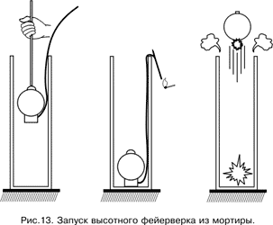 а) срабатывание разрывного заряда на малой высоте. Это может быть вызвано дефектом конструкции или применением пусковой мортиры несоответствующей данному фейерверку.