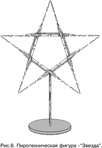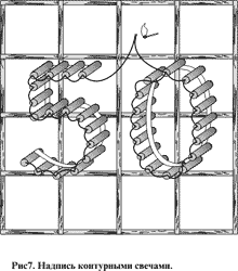 Контурные свечи предназначены для создания небольшого яркого цветного факела. Контурные свечи размещаются по контуру рисунка или надписи. С помощью быстрогорящего стопина или электровоспламенителей контурные свечи одновременно вспыхивают и создаваемая ими цветная огненная картина или надпись, рис.7