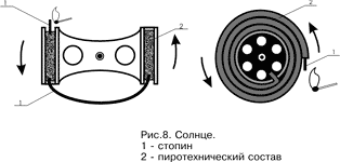 - очень эффектный фейерверк, который вращается вокруг горизонтальной оси и разбрасывает во все стороны искры, образуя яркий цветной круг.