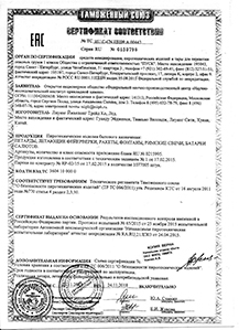 Официальный сайт «Русский фейерверк» реализует пиротехнику, произведенную в соответствии с высочайшими стандартами и прошедшую сертификацию в РФ. Наш фирменный магазин «Русский фейерверк» предоставляет самую разнообразную пиротехнику, красочно оформленную, разрешенную к розничной продаже и безопасную - при условии соблюдения инструкции по применению. Любые фейерверки вы можете выбрать и купить с доставкой на дом. При этом, в зависимости от объема заказа пиротехники, действуют скидки.